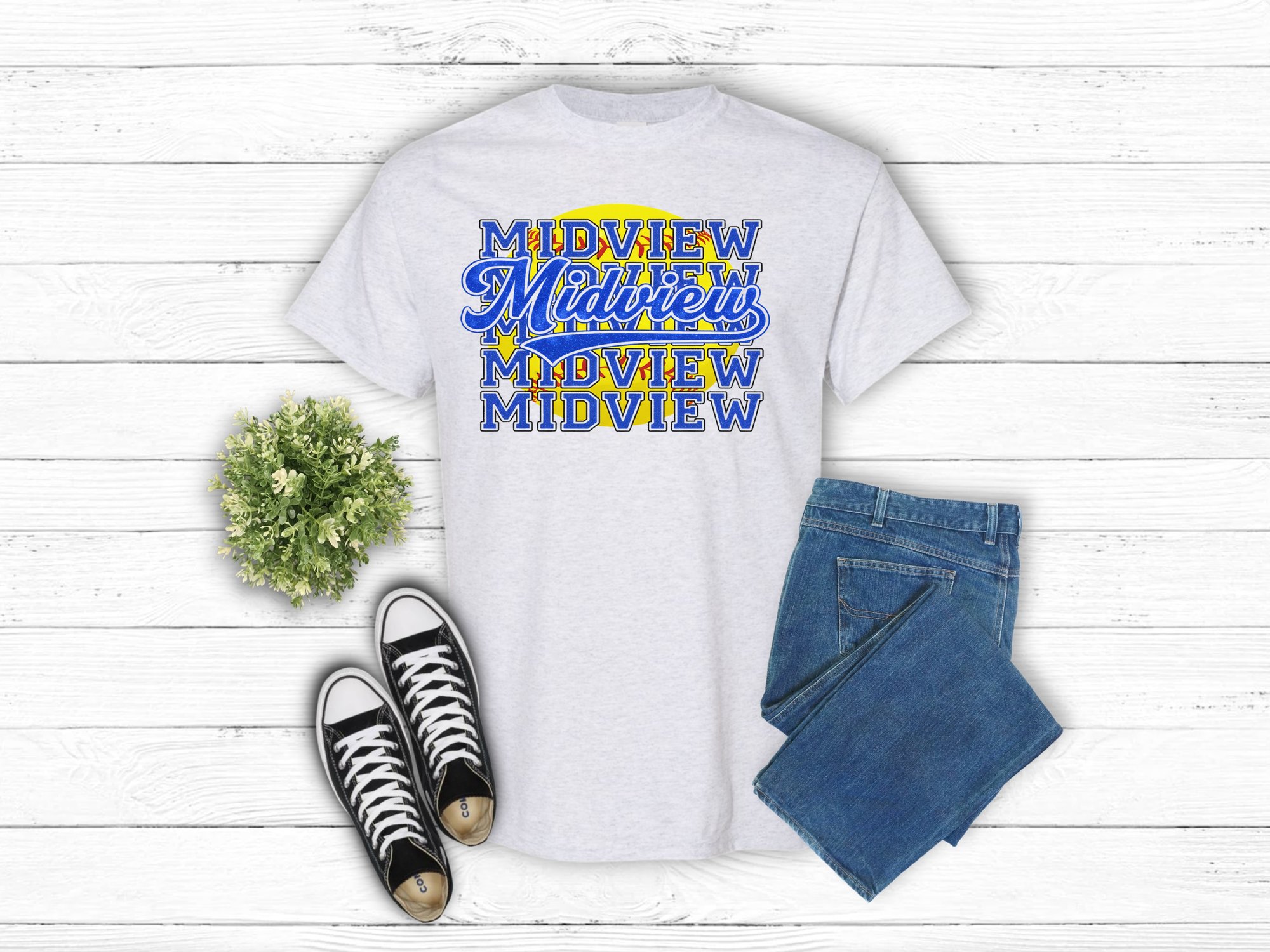 • Detailing: A bright yellow softball sits in the background, peeking through the crisp white distressed lettering.