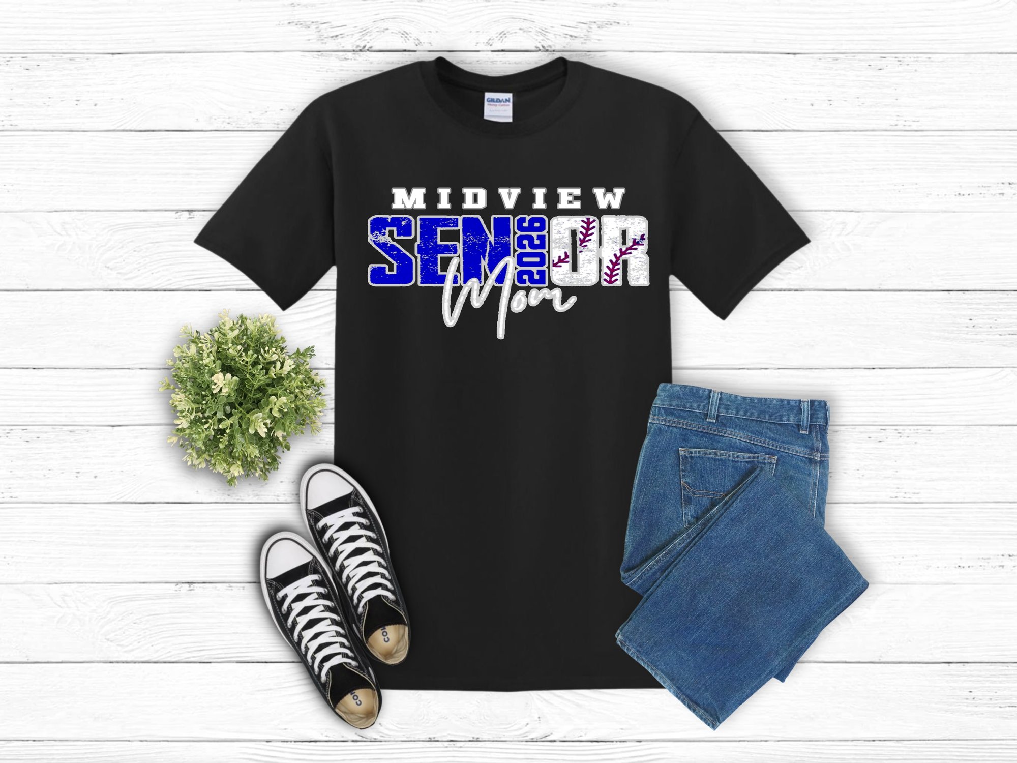 This Midview Senior Mom tee is a must-have for the 2026 baseball season! Designed with a vibrant royal blue base and custom "SENIOR" graphics, it features stylish baseball stitching and crisp white script—perfect for cheering from the bleachers or attending Senior Night.